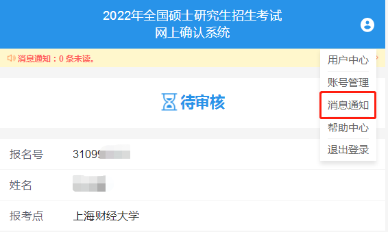 一般情况下,审核结果36小时内通过确认系统反馈,系统将通过短信和站内信提醒考生,请及时登录系统查询审核结果。审核站内信查收方式见下图:
